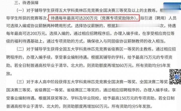 浙江台州一所县级中学,开出最高200万年薪招竞赛教练。这事表面是招聘,实际反映的是县中竞争压力。学校主动抢人才,说明竞赛成绩已经成了学校吸引生源的重要手段。当县中也开始用高薪挖竞赛教练,说明这种竞争正在向更广的范围蔓延。